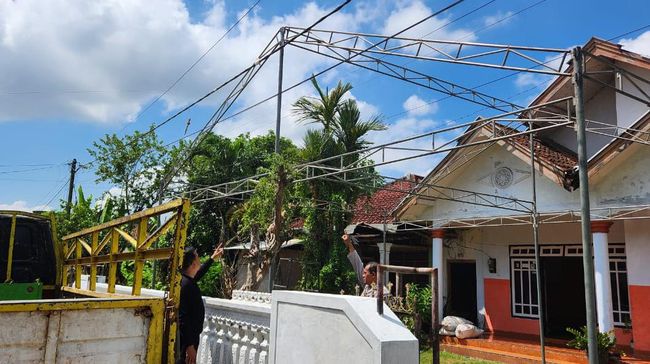 Sesaat sebelum tersengat listrik, Jaenuri memasang rangka atap tenda. Dia berada di ketinggian sekitar 3 meter.