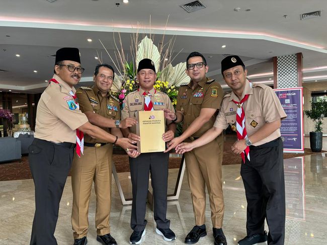 Ketua Kwartir Daerah Gerakan Pramuka Jawa Timur Arum Sabil bersama jajaran pengurus Kwarda menerima Surat Keputusan (SK) Pengurus Kwarda Jatim masa Bakti 2020-2025 di Taman Rekreasi Wiladatika Cibubur Jakarta.