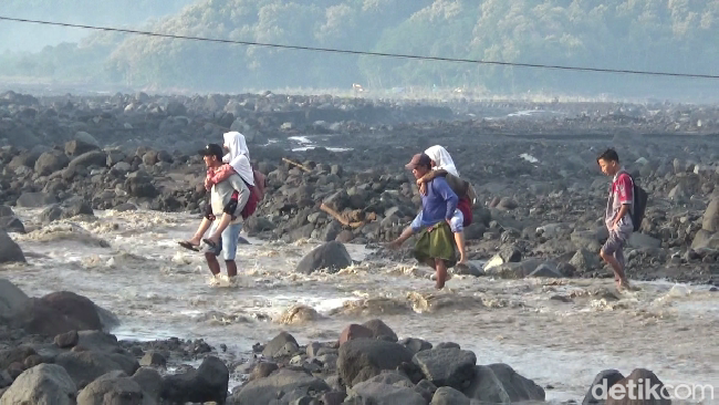 "Air sungainya cukup deras sehingga anak-anak harus digendong saat berangkat ke sekolah. Jembatannya diterjang banjir lahar Gunung Semeru sehingga tidak bisa dilalui," ujar salah satu orang tua siswa Andik kepada detikJatim, Kamis (25/4/2024).