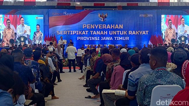 Menteri Agraria dan Tata Ruang yang juga Kepala Badan pertanahan Nasional (ATR/BPN) Agus Harimurti Yudhoyono lebih dulu tiba sebelum Presiden Joko Widodo (Jokowi) di GOR Tawangalun, Banyuwangi. Dia sampaikan sambutan untuk warga penerima Sertifikat Tanah Elektronik Hasil Redistribusi.