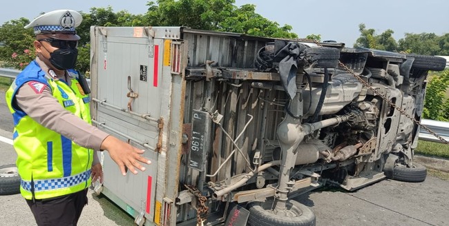 Mobil pikap boks nopol W 9611 P terguling gegara mengalami pecah ban di KM 718+200B Tol Surabaya-Mojokerto (Sumo). Kecelakaan tunggal ini mengakibatkan sopir pikap menderita luka ringan.