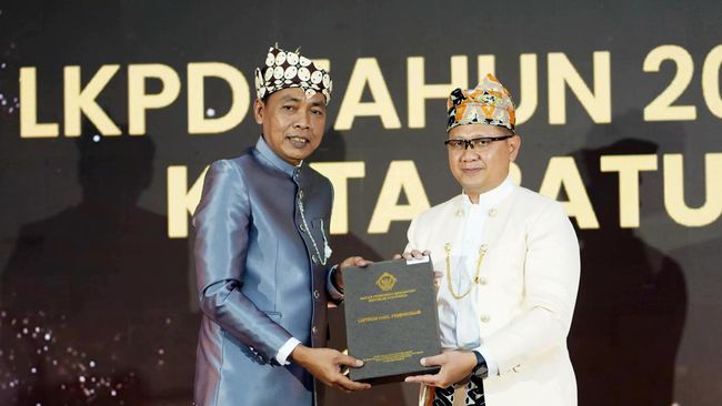 Pj Wali Kota Batu Aries Agung Paewai menerima Laporan Hasil Pemeriksaan (LHP) atas Laporan Keuangan Pemerintah Daerah (LKPD) tahun 2023 dari Kepala Kantor BPK Perwakilan Provinsi Jawa Timur, Karyadi. Kota Batu kembali mendapatkan opini Wajar Tanpa Pengecualian (WTP).