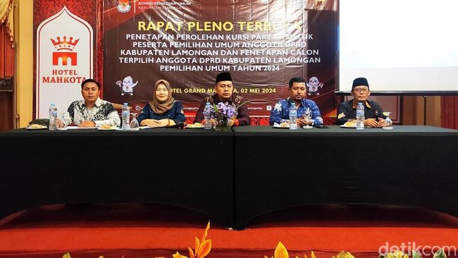 "Kami telah menggelar rapat pleno terbuka penetapan perolehan kursi partai politik peserta pemilihan umum anggota DPRD Lamongan dan penetapan calon terpilih anggota DPRD Lamongan Pemilihan Umum Tahun 2024 pada Kamis malam (2/5)," kata Ketua KPU Lamongan Mahrus Ali kepada wartawan, Jumat (3/5/2024).