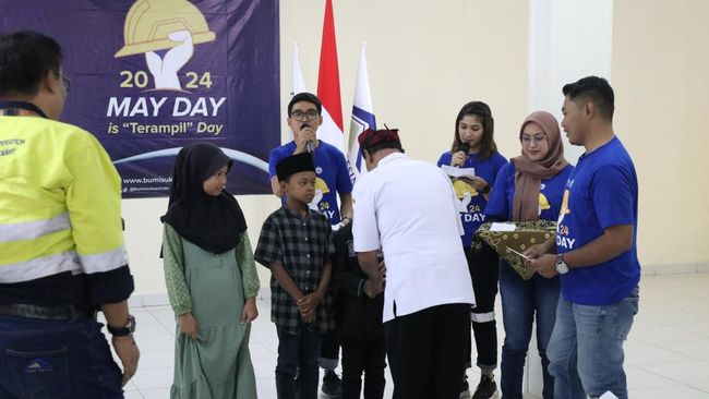 Peringatan Hari Buruh di tambang emas gunung Tumpang Pitu, Desa Sumberagung, Pesanggaran, itu juga diisi dengan pemberian santunan kepada 20 anak yatim dan kaum duafa lingkar tambang.