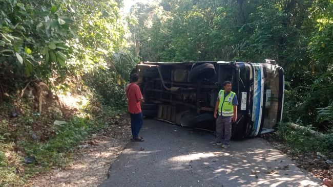 Bus terguling karena diduga tak kuat melintasi jalan menanjak yang berada di Desa Sringonco, Bantur, Kabupaten Malang, Sabtu (4/5/2024), pukul 15.00 WIB.