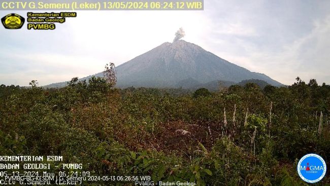 Gunung Semeru erupsi 5 kali pagi ini. Erupsi terjadi mulai pukul 01.14 WIB hingga 06.23 WIB, Senin (13/5/2024).