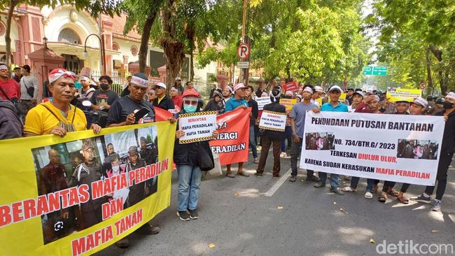 Puluhan orang mengatasnamakan Aliansi Masyarakat Peduli Keadilan (AMPI) menggelar demo di depan Pengadilan Negeri Surabaya Jalan Arjuno. Mereka menyebut Crazy Rich Surabaya Budi Said sebagai mafia tanah.