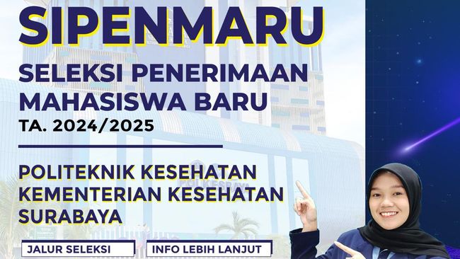 Kementerian Kesehatan (Kemenkes) telah membuka pendaftaran sekolah kedinasan Politeknik Kesehatan (Poltekkes) Surabaya atau seleksi penerimaan mahasiswa baru (Sipenmaru) 2024. Pendaftaran jalur mandiri gelombang 2 masih dibuka. Simak jadwal hingga biayanya di bawah ini.