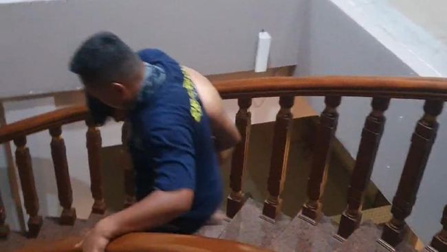 Salah satu pria dengan kaus bertulisan 'security' memiting brondong selingkuhan itu lalu dibawa turun melalui tangga dari selasar lantai 2 hingga ke parkiran. Saat dikeler itulah sang pemuda dipaksa telanjang. Handuk yang tadinya menutup bagian kemaluannya dipaksa dilepas oleh sang suami.