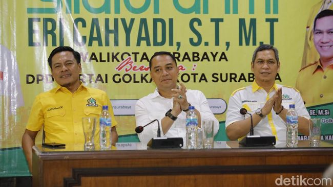 Eri Cahyadi datang ke Kantor DPD Golkar Surabaya tanpa Armuji. Dia datang selain untuk bersilaturahmi juga membincangkan tentang dukungan Golkar terhadap dirinya di Pilwali 2024. Ketua DPD Golkar Surabaya Arif Fathoni mengapresiasi keseriusan Eri Cahyadi.