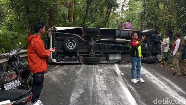 Isuzu Elf mengangkut rombongan wisatawan mancanegara terguling di Jalur Erek-Erek Kawah Ijen, Banyuwangi. Kendaraan itu terguling usai menabrak pembatas jalan hingga seluruh kaca samping mobil itu pecah.