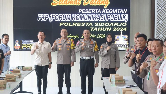 Polresta Sidoarjo menggelar forum komunikasi publik dengan melibatkan sejumlah elemen masyarakat, mahasiswa dan kelompok disabilitas, Selasa (21/5/2024). Tujuan dari kegiatan itu yakni sebagai langkah optimalisasi layanan publik di lingkup Polresta Sidoarjo.