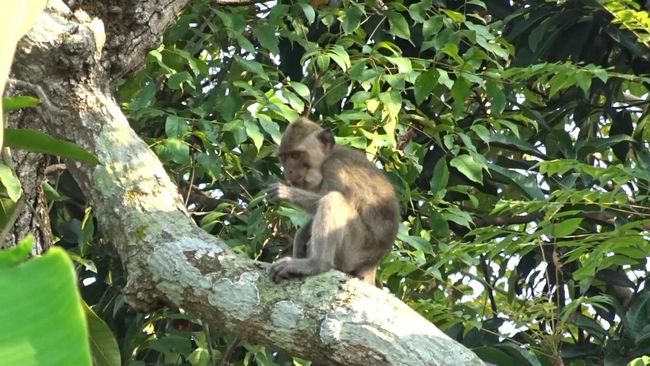 Monyet ini berkeliaran seenaknya dan bahkan berani mencomot makanan milik warga. Setelah mengambil makanan, monyet kembali bersembunyi di dahan pohon.