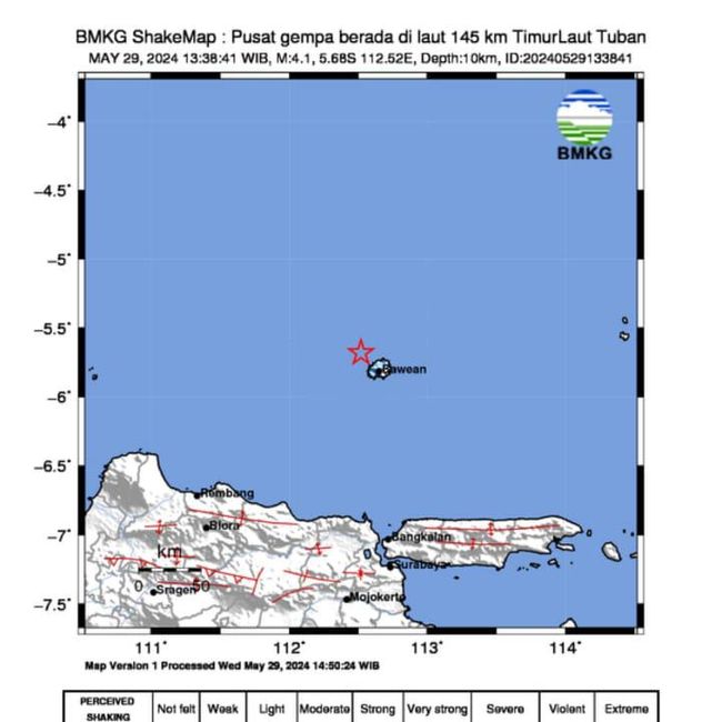 Gempa berkekuatan Magnitudo 4,1 mengguncang Tuban. Getaran gempa dirasakan hingga ke Bawean.