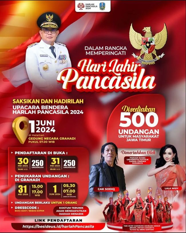 Mengutip Instagram resmi Dinas Kebudayaan dan Pariwisata Provinsi Jatim @disbudparjatimprov, berikut ini informasi jadwal upacara Harlah Pancasila 2024 di Surabaya.