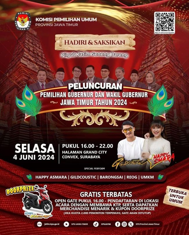 Komisi Pemilihan Umum (KPU) Jawa Timur menggelar peluncuran Pemilihan Gubernur dan Wakil Gubernur Jatim 2024. Acara tersebut akan berlangsung di Grand City Convex, Surabaya.