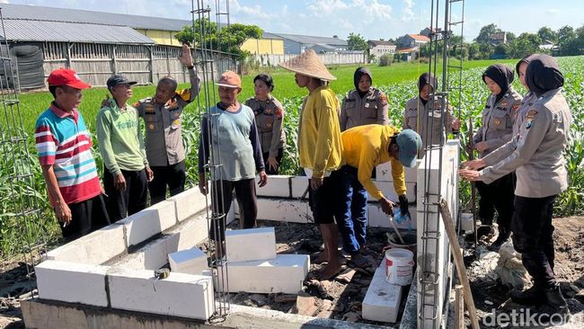 Kapolres Mojokerto AKBP Ihram Kustarto memantau langsung pembangunan bak penampungan air di Desa Jabon. Sejumlah polwan juga hadir untuk membantu para pekerja memasang bata. Selanjutnya, polisi bersama para pekerja menggelar syukuran dengan makan bersama di lokasi proyek.