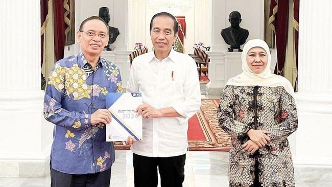 Rektor Unair Prof Dr Mohammad Nasih didampingi Ketua IKA Unair Khofifah Indar Parawansa baru saja bertemu Presiden Joko Widodo di Istana Merdeka, Selasa (11/6). Apa isi pembahasan mereka?