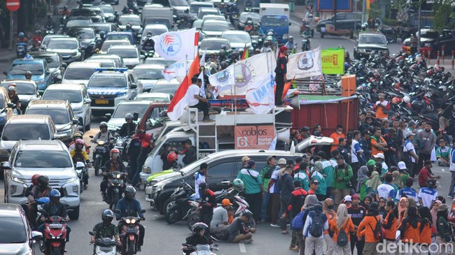 Pantauan di lokasi, massa buruh berdatangan secara bergelombang ke Jalan Jalan Gubernur Suryo sejak siang. Mereka datang dengan menggunakan motor serta kendaraan komando.
