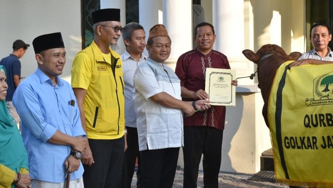 Selain itu Golkar Jatim juga menerima hewan kurban dari Ketum PP Muslimat NU Khofifah Indar Parawansa.
