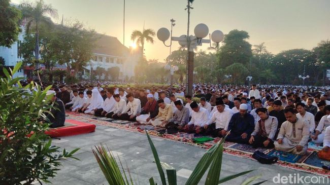 Dari pantauan detikJatim, para jemaah berdatangan di halaman Balai Kota Surabaya sejak pukul 05.30 WIB. Sedangkan salat Idul Adha dimulai tepat pukul 06.00 WIB.