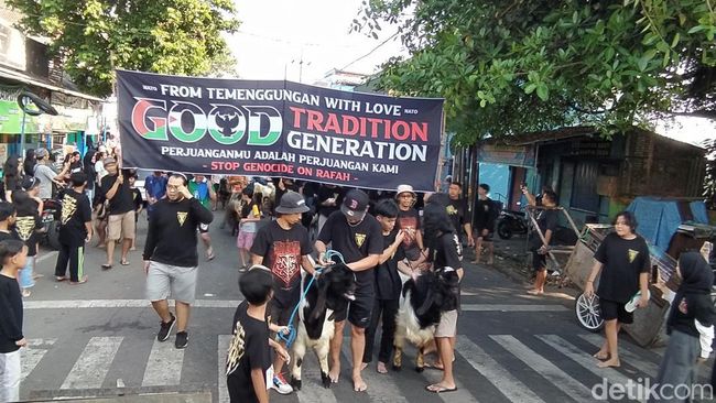 Arak-arakan hewan kurban menjadi salah satu tradisi rutin setiap Idul Adha di Kota Malang. Kali ini, momen arak-arakan di Temenggungan, Kelurahan Sukoharjo, Kecamatan Klojen juga menyuarakan dukungan untuk Palestina.