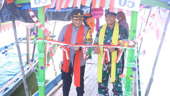 Ratusan warga memadati area wisata Waduk Sangiran Ngawi. Mereka menyaksikan berbagai lomba olahraga termasuk menghias perahu menyambut HUT ke-78 Bhayangkara.