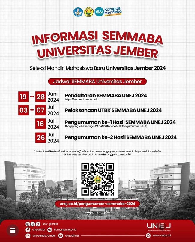 Untuk info selengkapnya, calon mahasiswa bisa langsung mengakses laman berikut https://unej.ac.id/pengumuman-semmaba-2024/