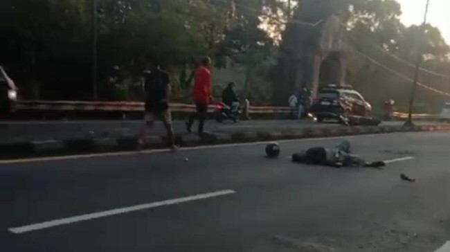 Sesampainya di lokasi kejadian, tiba-tiba dua orang menyeberang jalan. Pengendara motor itu tak sempat menghindar atau mengerem hingga menabrak salah satu penyeberang.