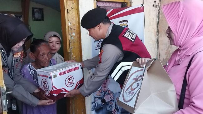 Polisi memberikan paket sembako ke anak yatim, janda, dan warga yang membutuhkan di Bojonegoro. Kegiatan ini dipimpin Kasat Samapta Polres Bojonegoro AKP Harjo.