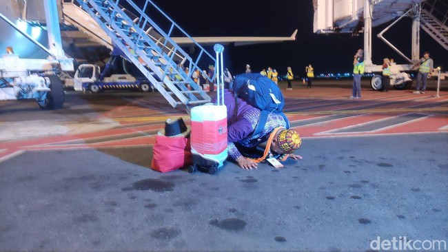 Kloter pertama jemaah haji yang pulang dari Tanah Suci tiba di Bandara Internasional Juanda. Setelah turun dari pesawat, sejumlah jemaah langsung sujud syukur.