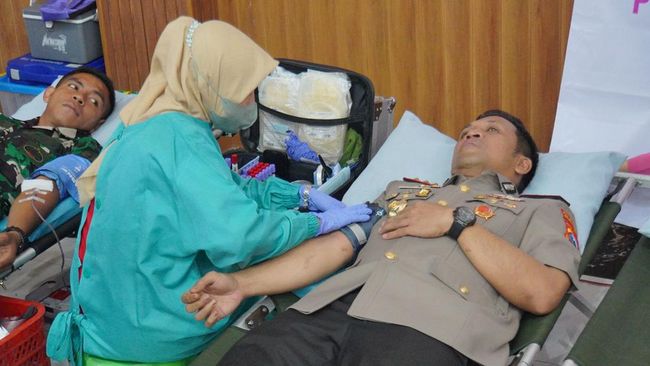 Kegiatan donor darah dibuka Kapolresta Sidoarjo Kombes Christian Tobing bersama Ketua Bhayangkari Cabang Kota Sidoarjo Ny. Dani Tobing, pada Senin (24/6/2024) di Gedung Serbaguna Polresta Sidoarjo.