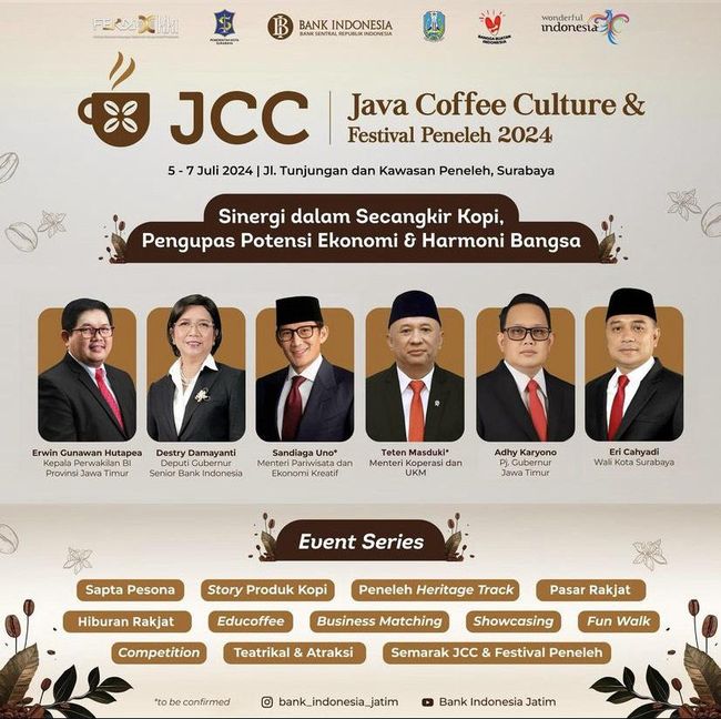 Bank Indonesia Jawa Timur tahun ini kembali menggelar Java Coffee Culture (JCC) dan Festival Peneleh bekerjasama dengan Pemkot Surabaya. Sejumlah kepala daerah hingga menteri akan hadir jadi narasumber.