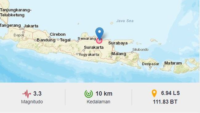 Gempa berkekuatan Magnitudo 3,3 mengguncang Tuban. Gempa terjadi pukul 04.14 WIB.