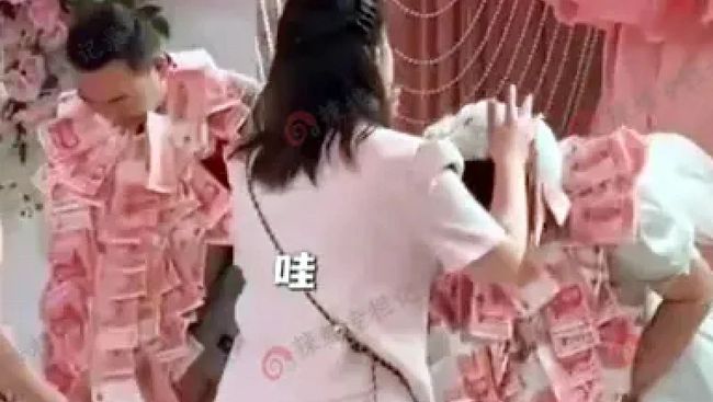 Pernikahan itu terjadi di Provinsi Hubei, China Tengah. Di video yang viral di Douyin disebutkan bahwa tumpukan uang yang dikalungkan ke mempelai itu terdiri dari uang 100 yuan (Rp 224 ribu) senilai total 160 ribu yuan (sekitar Rp 359 juta) yang merupakan saweran dari 8 saudara mempelai itu.