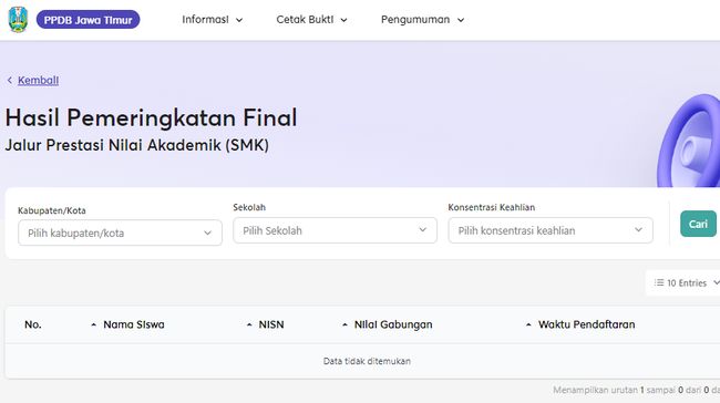 Pengumuman PPDB SMK Jatim jalur prestasi nilai akademik sudah bisa dilihat peserta didik baru mulai pukul 08.00 WIB. Calon siswa SMK bisa mengecek melalui link yang sama seperti saat melakukan pendaftaran. Berikut link pengumuman PPDB SMK Jatim tahap 5.