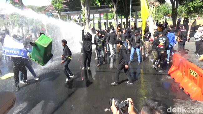 Melihat situasi yang tidak kondusif, polisi meminta mahasiswa untuk membubarkan diri. Polisi menyemprotkan air menggunakan kendaraan water canon ke arah mahasiswa. Namun, para mahasiswa membalas melemparkan tempat sampah dan botol air mineral.