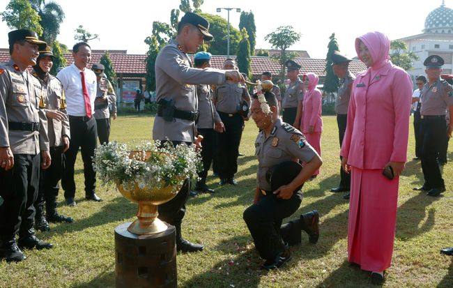 Siraman air kembang sudah menjadi tradisi di Polres Jombang untuk menandai kenaikan pangkat personelnya. Kali ini, 62 personel yang naik pangkat menjalani tradisi tersebut.