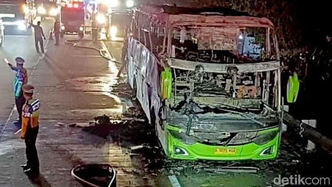 "Diduga bus mengalami korsleting listrik di bagian belakang sehingga kap mesin keluar asap. Kemudian bus menepi di bahu jalan, lalu terbakar," tandasnya.