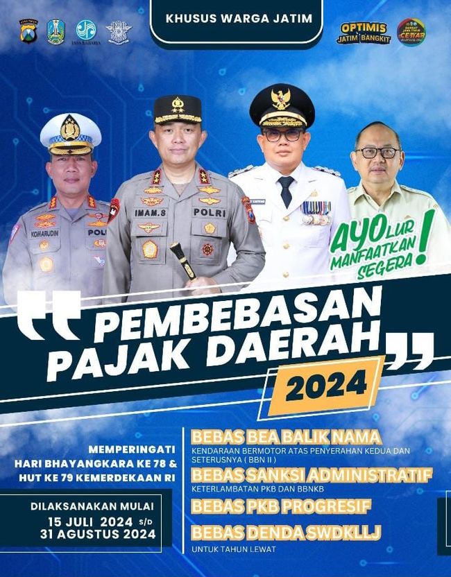 Pemerintah Provinsi (Pemprov) Jawa Timur bekerja sama dengan Polda Jatim mengadakan program pemutihan pajak kendaraan bermotor. Kali ini, program pemutihan pajak ini digelar dalam rangka Hari Bhayangkara ke-78 dan menyambut HUT Kemerdekaan RI ke-79.