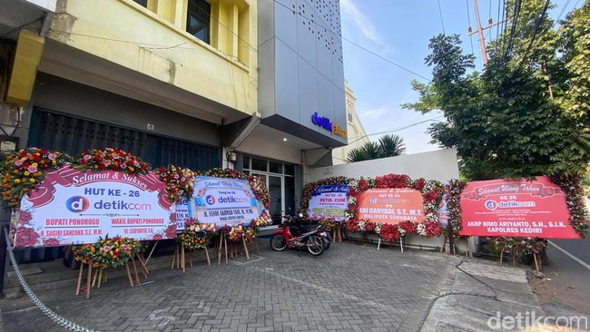 Semarak anniversary detikcom juga terasa di Jawa Timur. Puluhan karangan bunga turut menyemarakkan Hari Ulang Tahun (HUT) detikcom ke-26 di Kantor detikJatim, Jalan Upa Jiwa, Surabaya.
