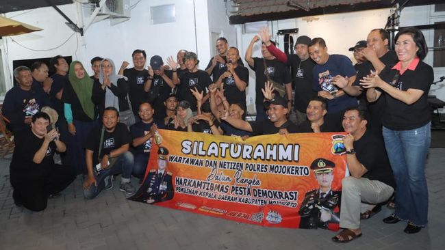 Kapolres Mojokerto AKBP Ihram Kustarto merangkul para jurnalis dan netizen dalam momen makan malam bersama. Ia meminta para awak media maupun netizen membantu kepolisian menciptakan Pilkada 2024 yang kondusif.