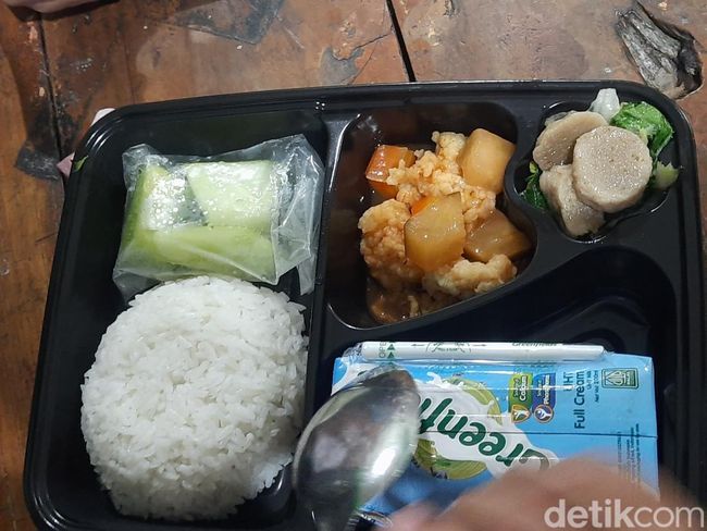 Menu makan siang itu disajikan dalam sebuah kotak yang berisi nasi, ayam goreng tepung, sayuran, lengkap dengan potongan buah dan susu UHT full cream.