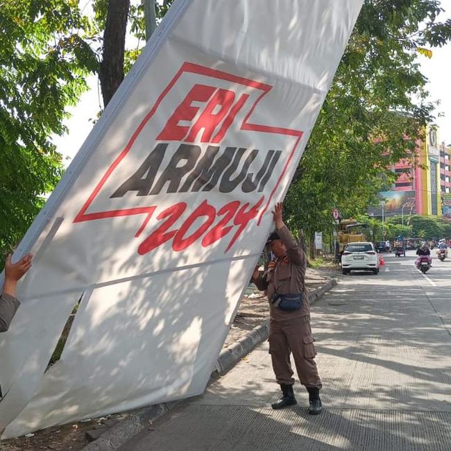 Baliho yang memuat gambar Eri Cahyadi berkaitan dengan Pilwali 2024 di sejumlah titik di Kota Pahlawan dicopot Satpol PP Surabaya. Lho, lho, lho, ada masalah apa dengan baliho itu?