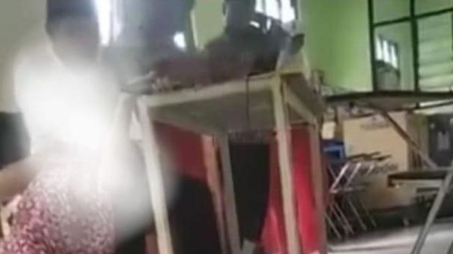 Terlihat dalam video berdurasi 30 detik yang viral di media sosial siswa laki-laki itu terlihat dipiting sang guru yang sedang duduk. Siswa yang memakai batik merah celana putih itu mencoba bertahan dan terlihat seperti tercekik.