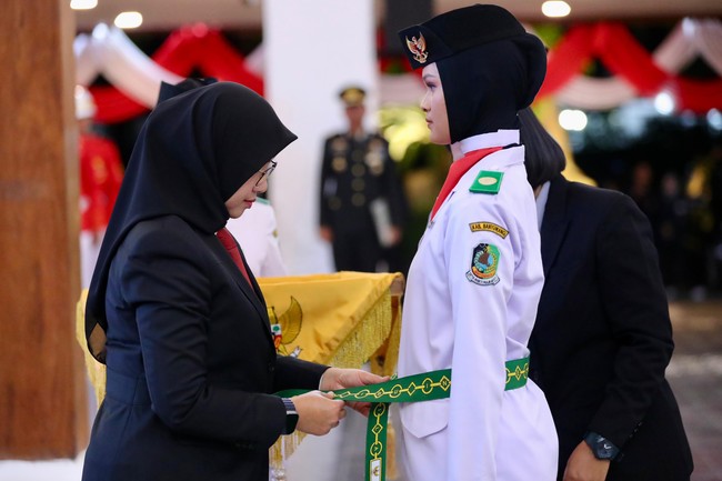 Bupati Banyuwangi Ipuk Fiestiandani mengukuhkan 75 pasukan pengibar bendera pusaka (Paskibraka) 2024 di Pendopo Sabha Swagatha Blambangan, Kamis malam (15/8/2024). Mereka akan bertugas pada upacara peringatan HUT ke-79 Kemerdekaan RI, di Taman Blambangan, 17 Agustus 2024.