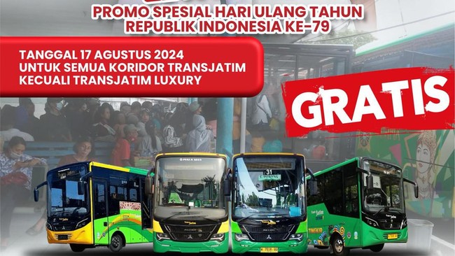 Pemprov Jatim menggratiskan tarif Bus TransJatim, kecuali Luxury, di semua koridor pada Sabtu (17/8/2024) atau bertepatan dengan peringatan HUT ke-79 Kemerdekaan RI.