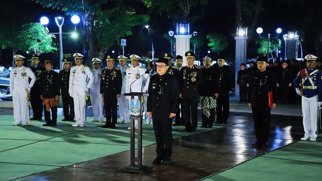 Penjabat (Pj) Gubernur Jawa Timur Adhy Karyono memimpin Apel Kehormatan dan Renungan Suci (AKRS) dalam rangka Peringatan HUT Ke-79 RI di Taman Makam Pahlawan 10 Nopember, Surabaya, Sabtu (17/8) dini hari.