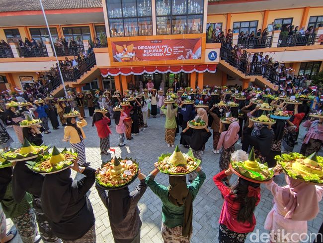 Pantauan detikJatim, 79 tumpeng sempat dibentuk membuat angka 79 sesuai jumlah angka HUT RI. Setelah didoakan, puluhan tumpeng dibawa ke kelas untuk dimakan bersama antara guru dan siswa.
