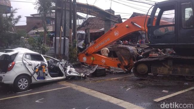 Namun muatan truk berupa ekskavator jatuh. Di saat bersamaan ekskavator menimpa Daihatsu Ayla nopol N-1702-WY dan Daihatsu Sigra nopol W-1031-TF.